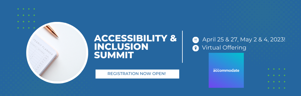 He is committed to disability justice in his scholarship, service, and teaching. His work brings together rhetoric, writing, disability studies, and critical pedagogy. His first book, entitled Disability Rhetoric, was published with Syracuse University Press in 2014. Academic Ableism: Disability and Higher Education was published with Michigan University Press in 2017 and is available in an open-access version online. Disabled Upon Arrival: Eugenics, Immigration, and the Construction of Race and Disability was published in 2018 with Ohio State University Press. Accessibility and Inclusion Summit on April 25 and 27, May 2 and 4, 2023! Virtual Offering Members: $129 - Non-Members: $179 Thank you to our event sponsor Accommodate by Symplicity