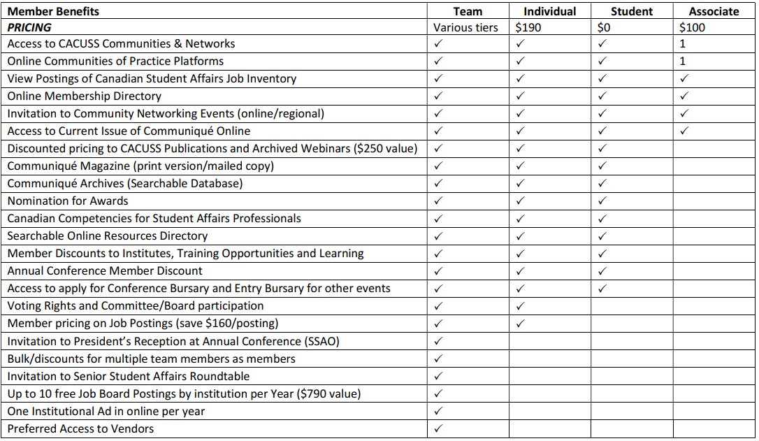 Full membership in CACUSS including access to all communities & networks, resource directories, member pricing on all events including the annual conference, voting rights, CACUSS publications, Awards and more.